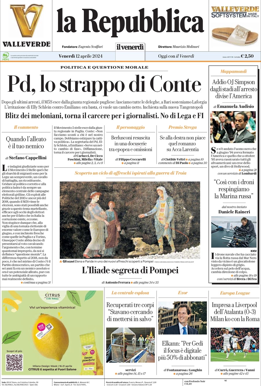 "Impresa a Liverpool dell'Atalanta (0-3). Milan ko con la Roma" scrive La Repubblica in prima pagina stamani. Spazio al calcio giocato e all'Europa League con l'impresa dell'Atalanta di Gian Piero Gasperini in casa del Liverpool: 0-3 ad Anfield con la doppietta di Scamacca e il gol di Pasalic. È stata la Roma di Daniele De Rossi invece ad aggiudicarsi il primo round del derby italiano in campo europeo e a decidere il derby ci ha pensato, a quattro giorni dal gol con la Lazio, il difensore Gianluca Mancini. In Conference League invece 0-0 tra Viktoria Plzen e Fiorentina.