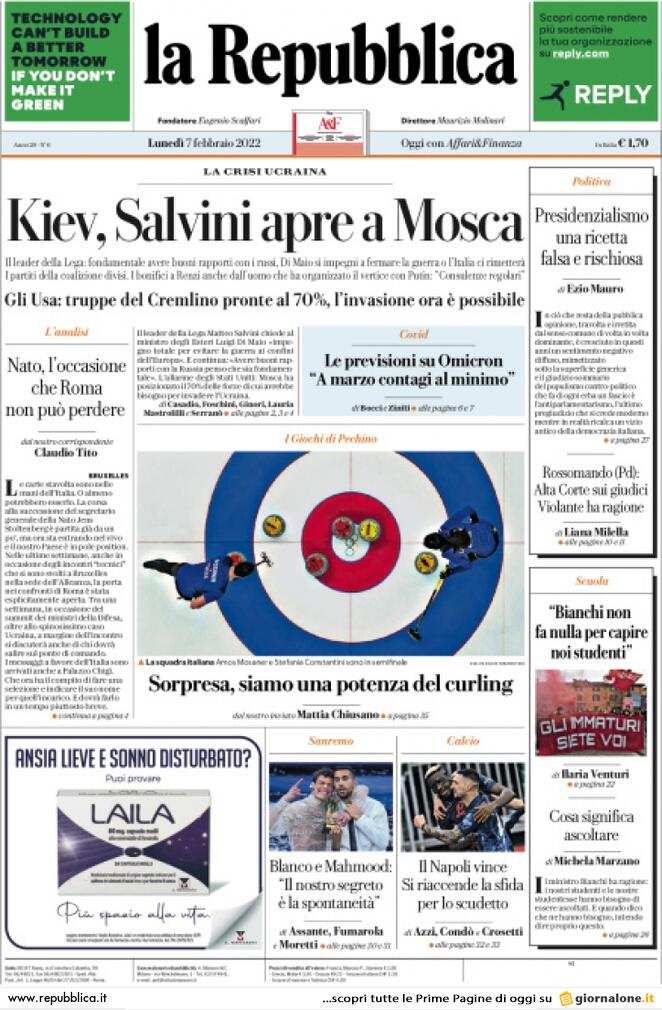L’edizione odierna de La Repubblica si sofferma in prima pagina sul successo ottenuto dal Napoli ieri a Venezia per 2-0, risultato che porta il club partenopeo a pari punti con il Milan e a -1 dall’Inter, prima della classe. “Il Napoli vince. Si riaccende la sfida per lo scudetto” il titolo proposto dal quotidiano questa mattina.
