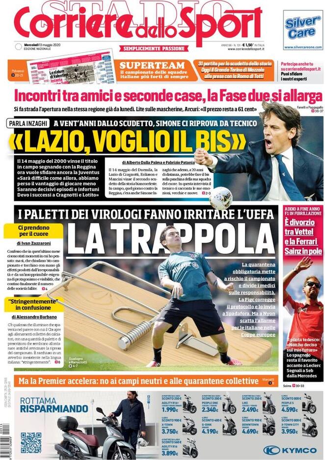"La trappola" è il titolo d'apertura del Corriere dello Sport in edicola questa mattina. I paletti dei virologi fanno irritare la UEFA. La quarantena obbligatoria per tutta la squadra in caso di un positivo mette a rischio il campionato e divide i medici sulle responsabilità. La FIGC corregge il protocollo e lo invia al Ministro Spadafora ma a Nyon scatta l'allarme per le italiane impegnate nelle coppe europee.