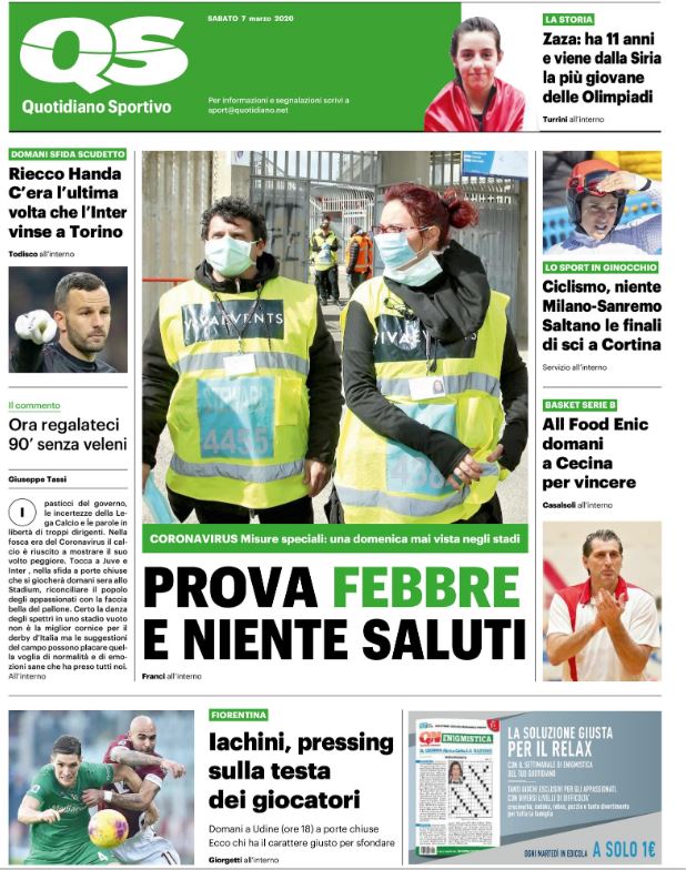 Il QS in edicola questa mattina si sofferma sulle “misure speciali” adottate in Serie A per contrastare l’emergenza Coronavirus. "Prova febbre e niente saluto", titola il Quotidiano Sportivo, che poi aggiunge sempre in prima pagina: “Una domenica mai vista negli stadi”. Non solo porte chiuse, dunque: bisognerà rispettare un preciso protocollo.