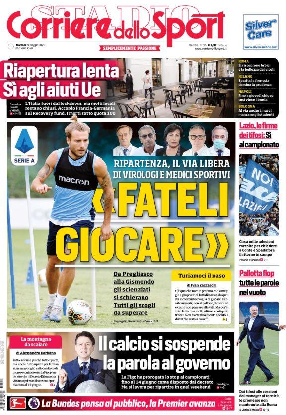 "Fateli giocare", è il titolo d'apertura scelto dal Corriere dello Sport in edicola quest'oggi. "Ripartenza, il via libera di virologi e medici sportivi. Da Pregliasco alla Gismondo, gli scienziati si schierano", scrive il noto quotidiano sportivo della Capitale. Ma la situazione resta incerta: "Il calcio si sospende, la parola al Governo", sottolinea in prima pagina il CorSport. "La Figc - si legge - ha prorogato lo stop ai campionati fino al 14 giugno come disposto dal decreto. Ma si lavora per ripartire in quel weekend".