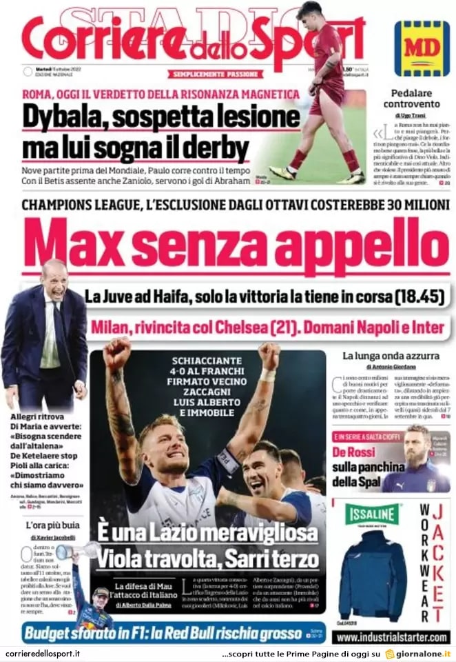 Stasera torna la Champions League e il Corriere dello Sport scrive questa mattina in prima pagina: "Milan, rivincita con il Chelsea". I rossoneri vogliono dimenticare il 3-0 dell'andata e dimostrare che quella di Londra di una settimana fa è stata solo una serata no. Si ferma De Ketelaere, out per un problema muscolare.