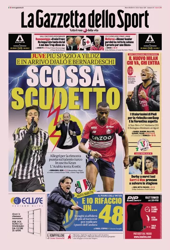 L'edizione odierna della Gazzetta dello Sport in prima pagina titola così sui rossoneri che sono concentrati sia sul mercato che sulla gara di stasera contro l'Atalanta valida per i quarti di Coppa Italia: "Il nuovo Milan: chi va, chi entra. I titolarissimi di Pioli per la rivincita con Gasp". In via Aldo Rossi si continua a lavorare per il mercato di gennaio (la priorità è un altro difensore centrale), ma si inizia a programmare anche la prossima stagione quando arriverà sicuramente un grande numero 9 . In uscita c'è Krunic, mentre Mirante e Kjaer sono a fine contratto. Romero e alcuni giovani andranno a giocare con continuità altrove.