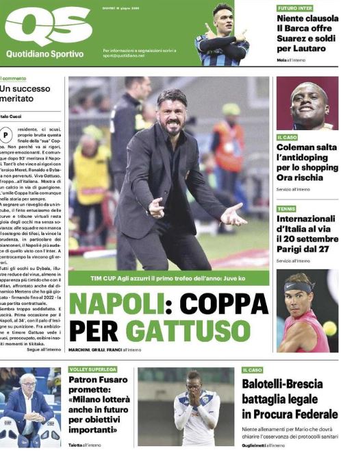 L’edizione odierna del QS dedica l’apertura alla vittoria di ieri del Napoli. "Coppa per Gattuso", titola il Quotidiano Sportivo, che poi aggiunge: "Agli azzurri il primo trofeo dell’anno: Juve ko". Un successo importante e meritato per la squadra di Rino, che nell’arco dei novanta minuti ha creato molte più occasioni da gol. Solo un grande Buffon ha permesso ai bianconeri di rimandare l’esito del match ai calci di rigore, poi tirati in modo impeccabile dai partenopei (4 gol su 4 tentativi).