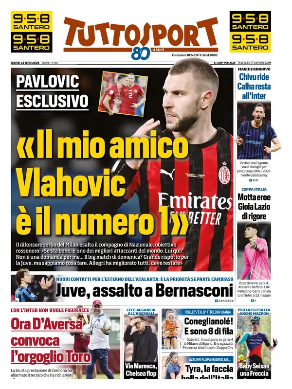 "Il mio amico Vlahovic è il numero 1. Allegri deve restare": l'edizione odierna di Tuttosport apre questa mattina in prima pagina con le parole di Strahinja Pavlovic che ha lasciato un'intervista esclusiva al quotidiano romano. Non è un mistero che il Milan sia alla ricerca di un nuovo attaccante e il nome di Dusan Valhovic, compagno di nazionale del difensore milanista, viene spesso accostato al Diavolo: "Se uno come lui farebbe comodo al Milan? Questa non è una domanda per me... Posso però dire che è un grande giocatore con tanta qualità: quando lui è in forma è il numero uno, il miglior attaccante del campionato e uno dei più bravi al mondo".