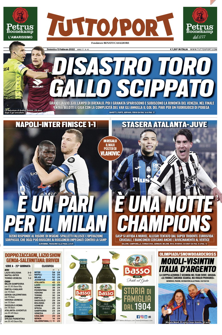 L’edizione odierna di Tuttosport dedica ampio spazio in prima pagina al big match tra Napoli e Inter giocato ieri al Maradona, tirando poi in ballo la squadra di Pioli. “È un pari per il Milan”, titola il noto quotidiano torinese, che poi aggiunge: “Dzeko risponde al rigore di Insigne: Spalletti fallisce l’operazione sorpasso, che oggi può riuscire ai rossoneri impegnati contro la Samp”.