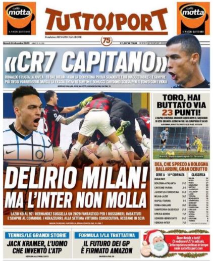 L’edizione odierna di Tuttosport esalta la squadra di Pioli in prima pagina dopo il successo di ieri. "Delirio Milan!", titola il quotidiano torinese, che poi aggiunge: "Ma l’Inter non molla". Ancora Tuttosport: "Lazio ko al 92esimo: Hernandez suggella un 2020 fantastico per i rossoneri, imbattuti e sempre al comando. I nerazzurri, alla settima vittoria consecutiva, restano in scia".