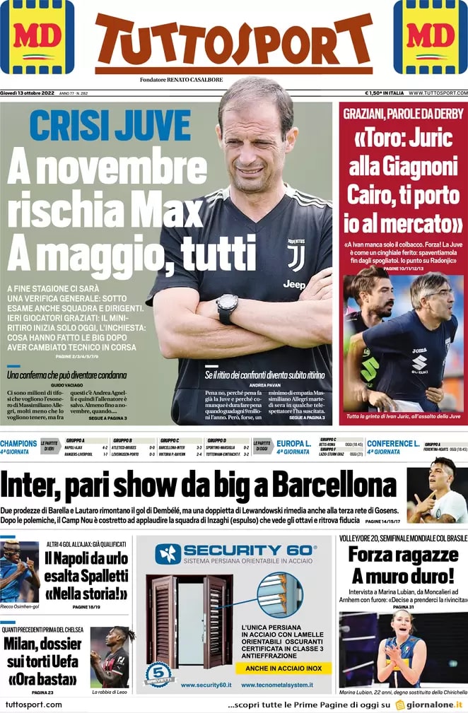 Sulla prima pagina odierna, in taglio basso, c'è spazio anche per i rossoneri: "Milan, dossier sui torti Uefa. 'Ora basta'". Non si placano le polemiche dopo l'ennesimo errore arbitrale subito dal Diavolo in Europa. L'inesistente rigore concesso al Chelsea è solo l'ultimo episodio a sfavore della squadra di Pioli dopo quelli nella scorsa Champions League contro Atletico Madrid e Porto (sia andata che ritorno).