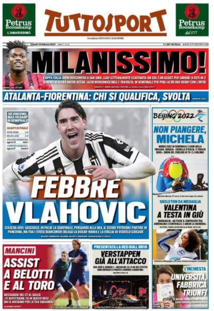 “Milanissimo!”. È il titolo che l’edizione odierna di Tuttosport dedica al Milan dopo la vittoria di ieri in Coppa Italia. “Show rossonero a San Siro”, scrive il quotidiano torinese, che poi aggiunge in taglio alto: “Leao letteralmente scatenato: un gol e un assist per Giroud (quattro reti in tre giorni). A segno anche Kessie. Lazio irriconoscibile e travolta. In semifinale per Pioli altri due derby con l’Inter”.