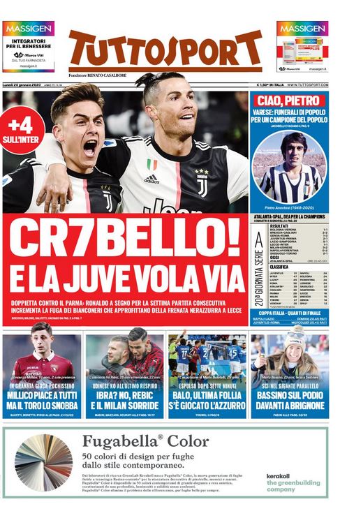Spazio sulla prima pagina di Tuttosport anche al Milan: "Ibra? No, Rebic. E il Milan sorride". Torna a sorridere la squadra di Stefano Pioli, due mesi dopo l'ultima volta a San Siro. E lo fa grazie ad Ante Rebic, uno degli oggetti misteriosi, fin qui, della stagione rossonera. Il croato prima pareggia la rete di Stryger Larsen, poi in pieno recupero regala i tre punti al Diavolo che può così volare in settima posizione in classifica, a due sole lunghezze dal Cagliari.