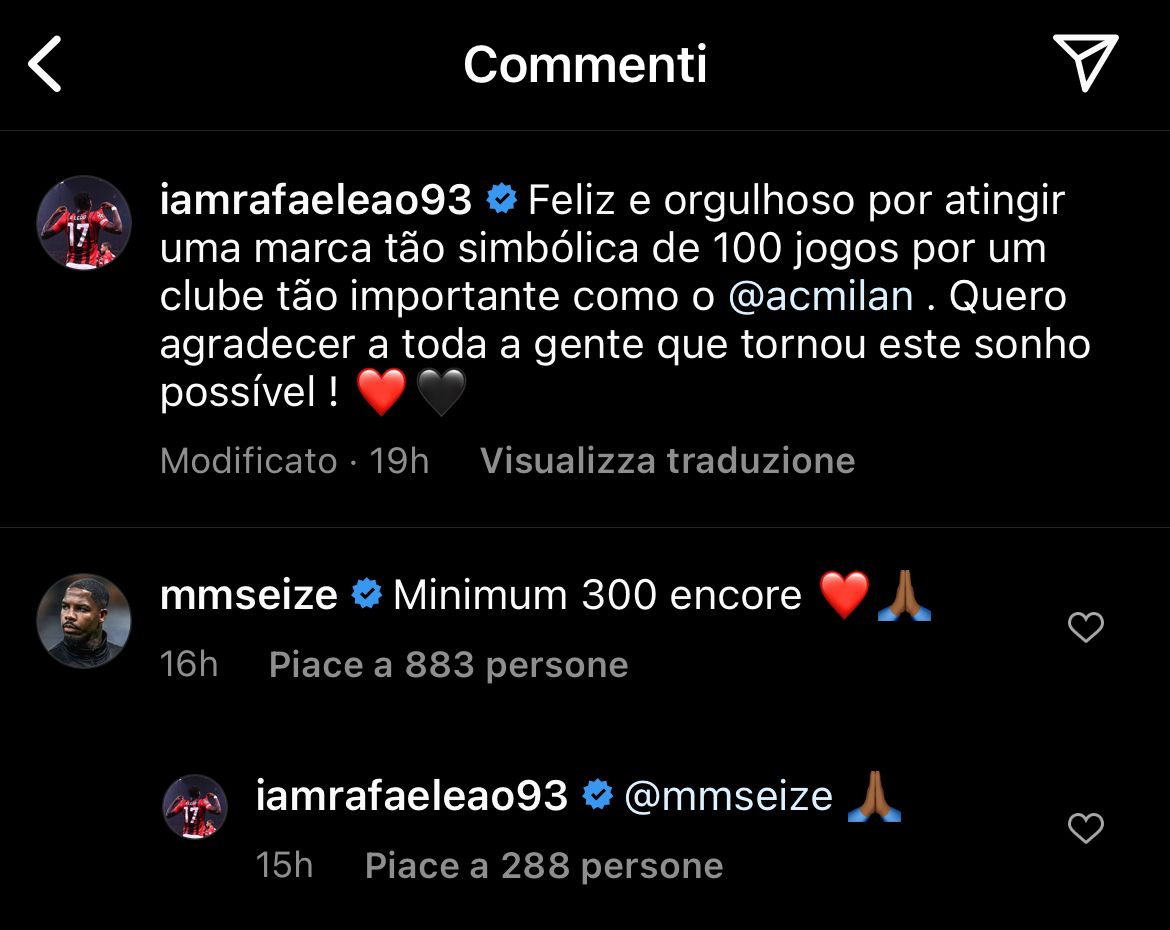Dopo essere stato premiato a Milanello da Paolo Maldini e da Frederic Massara per il traguardo delle 100 presenze con il Milan raggiunto domenica scorsa contro la Sampdoria, Rafael Leao ha pubblicato su Instagram questo messaggio: ""Felice e orgoglioso di aver raggiunto le cento presenze con la maglia del Milan, voglio ringraziare tutti coloro che hanno reso possibile questo sogno". Sotto questo post, è arrivato anche il commento anche di Mike Maignan, il quale ha scritto: "Minimo ancora 300".
