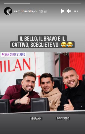 Samu Castillejo ha pubblicato una storia su Instagram con una foto scattata ieri sera a San Siro in occasione di Milan-Torino insieme a Brahim Diaz e ad Ante Rebic. Lo spagnolo ha accompagnato l'immagino con questo messaggio scherzoso: "Il bello, il bravo e il cattivo, scegliete voi".