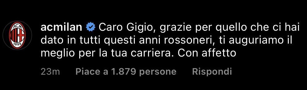 Intervenuto con un commento sotto il post d'addio di Gianluigi Donnarumma, il Milan ha ringraziato l'ormai ex portiere rossonero con un breve messaggio. Queste le parole utilizzate dal club: "Caro Gigio, grazie per quello che ci hai dato in tutti questi anni rossoneri, ti auguriamo il meglio per la tua carriera. Con affetto"