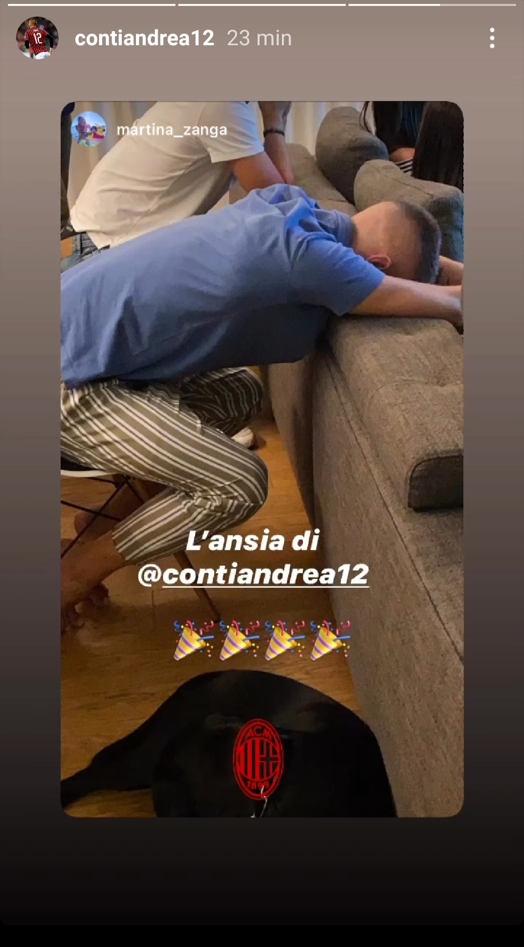 Andrea Conti, assente per infortunio dalla serata di Vila do Conte, ha assistito all'incredibile partita come tanti tifosi rossoneri, in piena tensione per il risultato. Il laterale destro ha ricondiviso una story della sua compagna, Martina Zanga, che lo ritrae disteso con il volto contro il divano, in preda all'ansia durante l'infinita lotteria dei rigori.