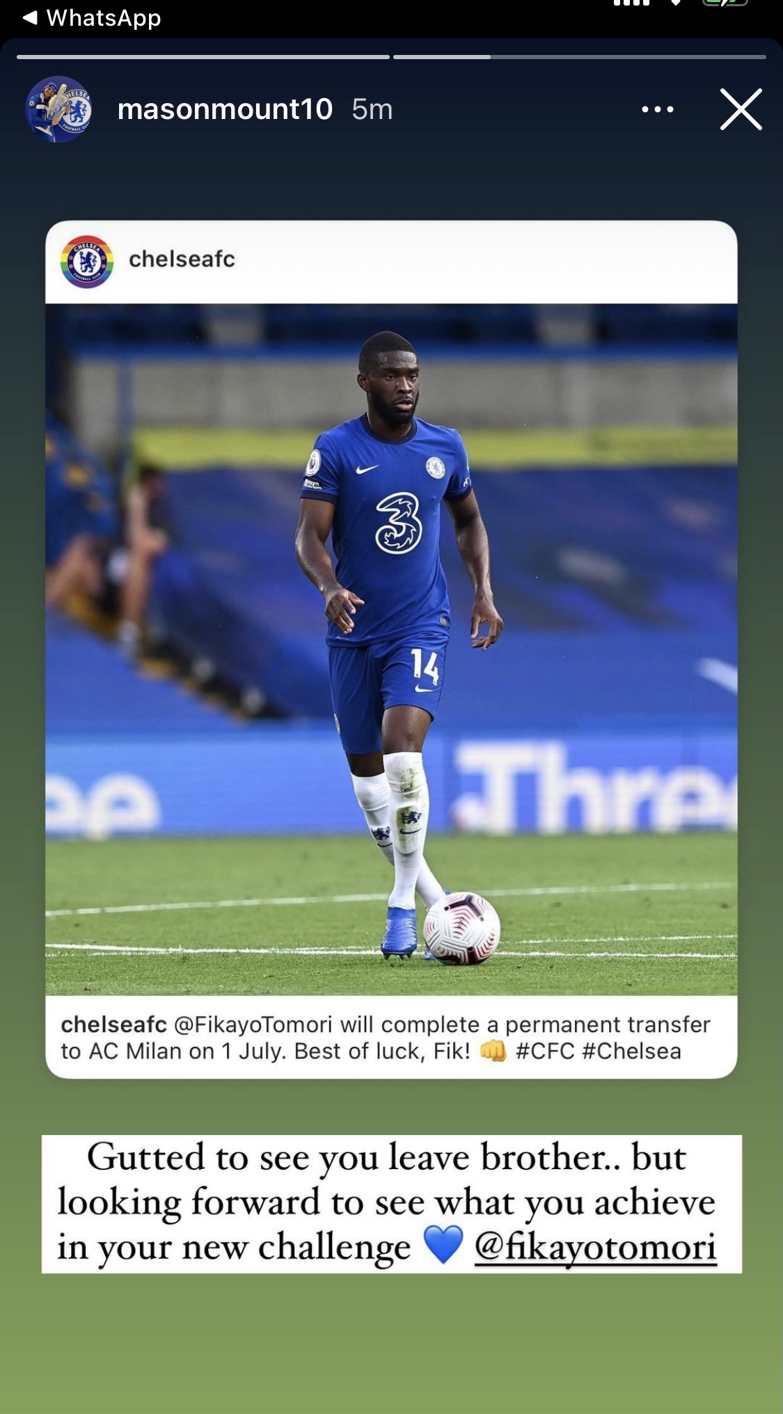 Intervenuto con una story sul proprio profilo Instagram, la stella del Chelsea Mason Mount ha commentato la partenza di Tomori dal club londinese in direzione Milan. Queste le sue parole: "Molto triste di vederti partire fratello..ma in attesa di vedere quello che potrai ottenere nella tua nuova sfida"