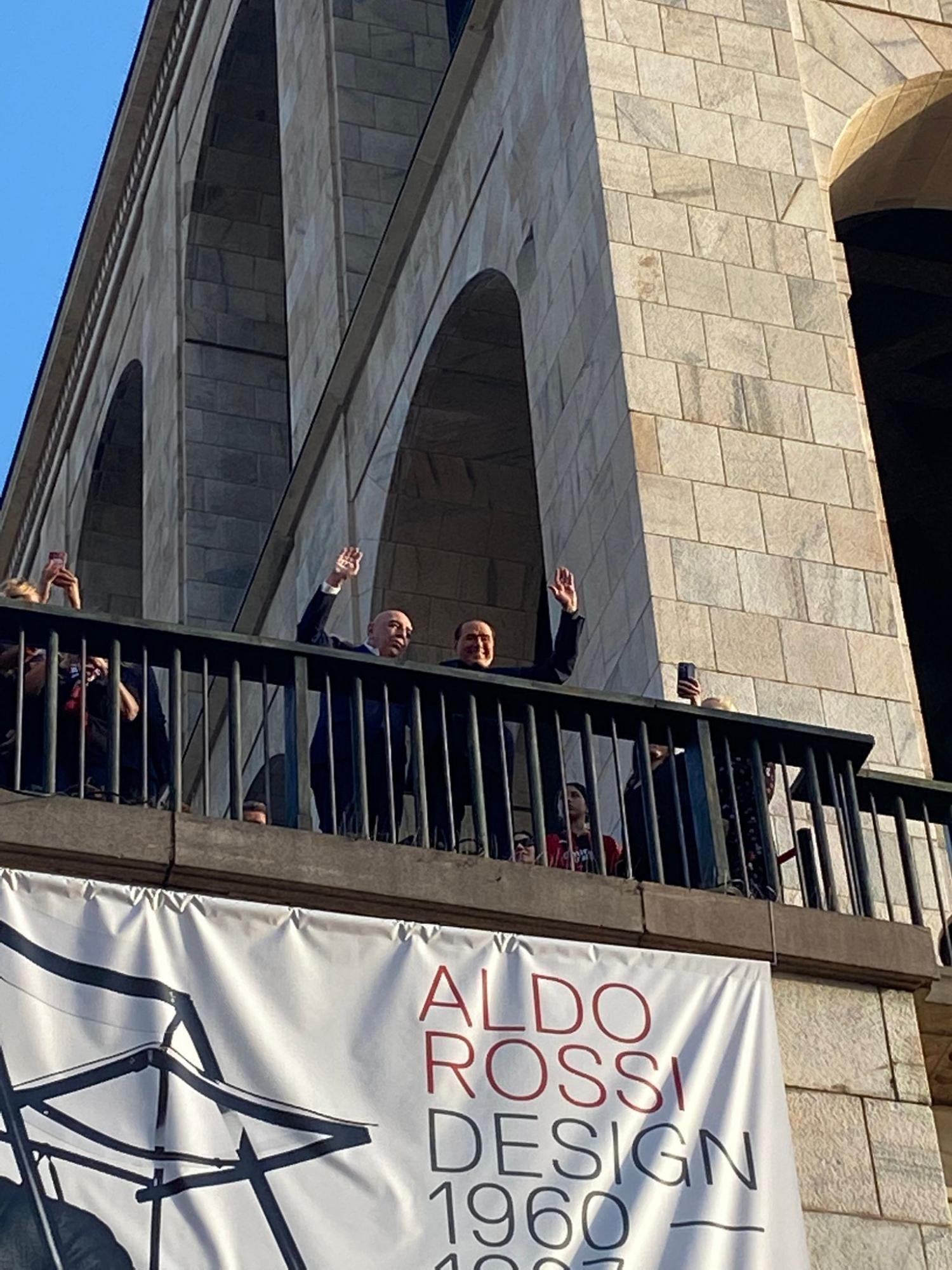 Oltre a Silvio Berlusconi, ci sarà anche Adriano Galliani alla festa scudetto del Milan di questa sera in un ristorante in piazza Duomo. Come testimonia la foto del nostro inviato, i due ex dirigenti rossoneri si sono affacciati dalla terrazza per salutare i tanti tifosi presenti. Al coro "Chi non salta nerazzurro è", hanno iniziato a saltare anche l'ex presidente e l'ex ad milanista.